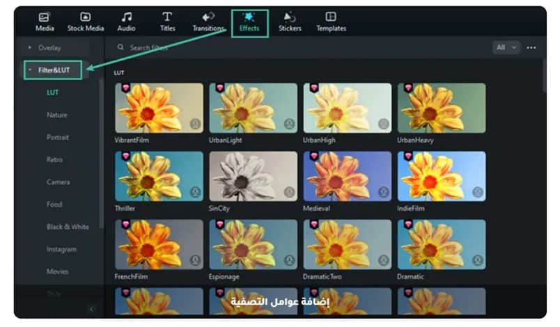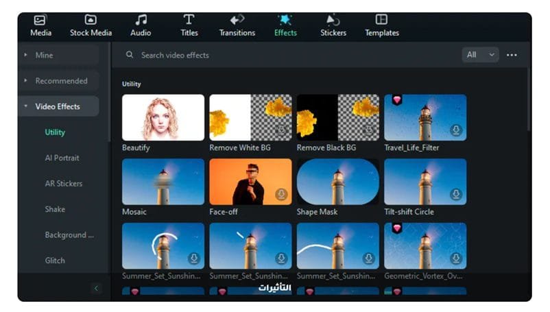 الميزة الأولى التي نود التحدث عنها هي الكم الهائل من تأثيرات الفيديو التي يمنحك هذا البرنامج الوصول إليها. يقدم لك Filmora المئات من تأثيرات الفيديو التي يمكنك استخدامها لجعل مقاطع الفيديو الخاصة بك تبدو أكثر جاذبية. ستتمكن من الوصول إلى جميع أنواع تأثيرات الفيديو مثل التأثيرات المرئية والتراكبات وتأثيرات النص وتأثيرات تصحيح الألوان والانتقالات وغير ذلك الكثير! ستساعدك هذه التأثيرات على ضمان استمتاع المشاهد بالفيديو.