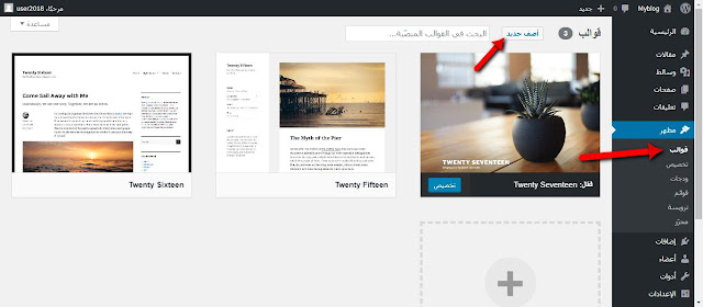 على العموم نقوم الان بدخول على القوالب من قائمة مظهر, سنجد 3 قوالب متوفرة للإستخدام بشكل افتراضي , قم باختيار احداها او اضغط على اضف جديد للأختيار قالب بين عشرات القوالب المجانية الاخرى.