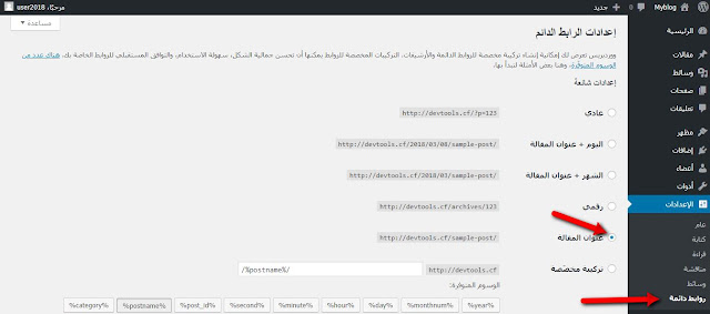 الان نقوم بعمل خطوة مهمة جدا ، الدخول على الروابط الدائمة في الاعدادات وتقوم بتغيير صيغة الرابط, هذه المرحلة جدا مهمة لانها ستساعدك مستقبلا مع محركات البحت.